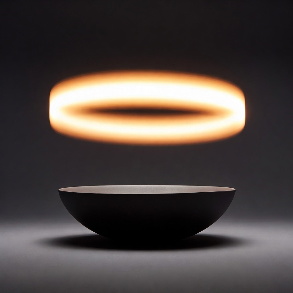 A bowl sits on a dark surface with a bright ring of light hovering above it, creating a visual focus in the space around it.