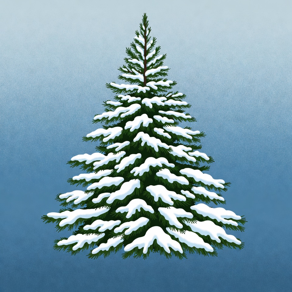 A large evergreen tree stands covered in snow against a blue background. It showcases the typical shape of a winter tree.