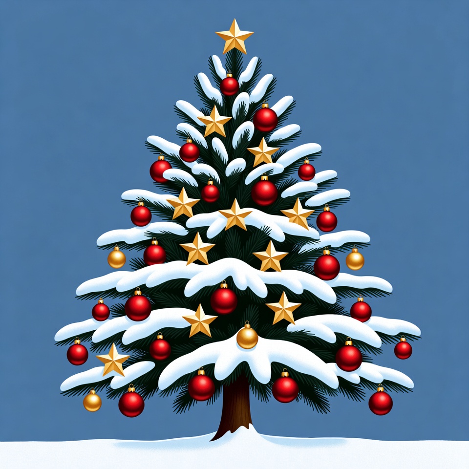 A Christmas tree stands with its branches covered in snow. Red and gold ornaments hang amidst golden stars on the green pine tree.
