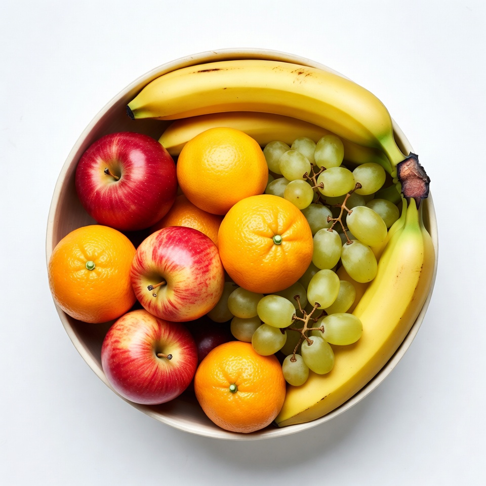 Bright bowl filled with bananas, apples, oranges, and grapes. The fruit is arranged neatly and displayed on a plain white surface.
