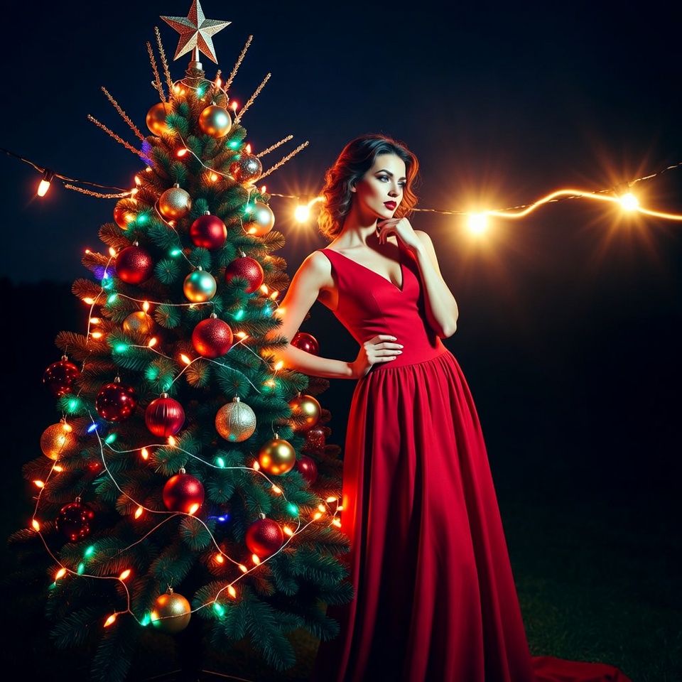 A woman in a red dress stands by a decorated Christmas tree at night, surrounded by colorful lights and ornaments.