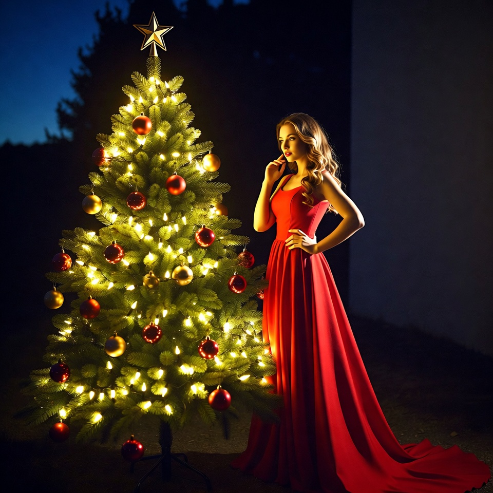 beauty, celebration, christmas tree, decoration, evening, fashion, festive, glow, holiday, joy, light, night, ornaments, outdoors, portrait, red dress, scene, star, winter, woman