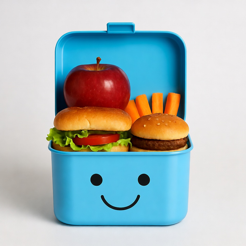 apple, blue, burgers, carrots, children, container, eating, food, fruit, healthy, items, kids, lunch, meal, packed, preparation, school, smiling, snacks, vegetables