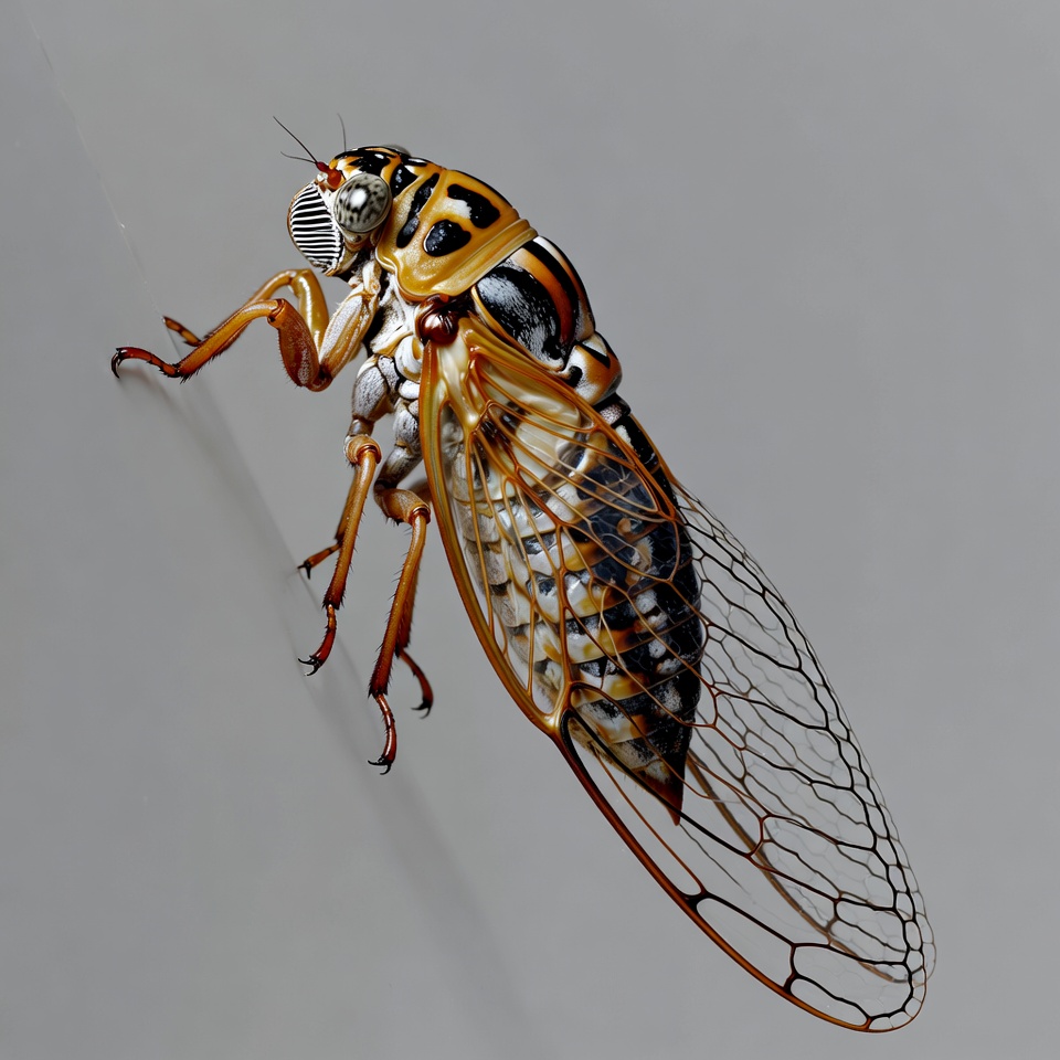 A cicada rests on a gray surface, showing details of its wings and body. The cicada has a mix of colors and a distinctive pattern.