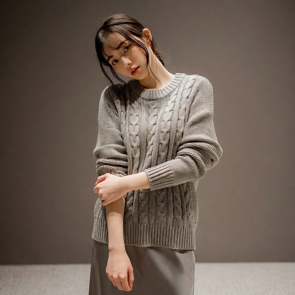 A model stands indoors wearing a gray sweater and skirt, striking a pose while looking at the camera with a focused expression.