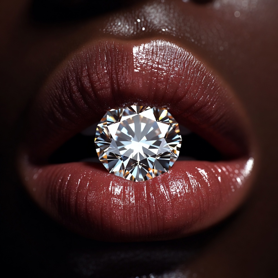 A person holds a large diamond between their lips. Their skin tone is dark, and their lips are shiny. This scene suggests beauty and luxury.