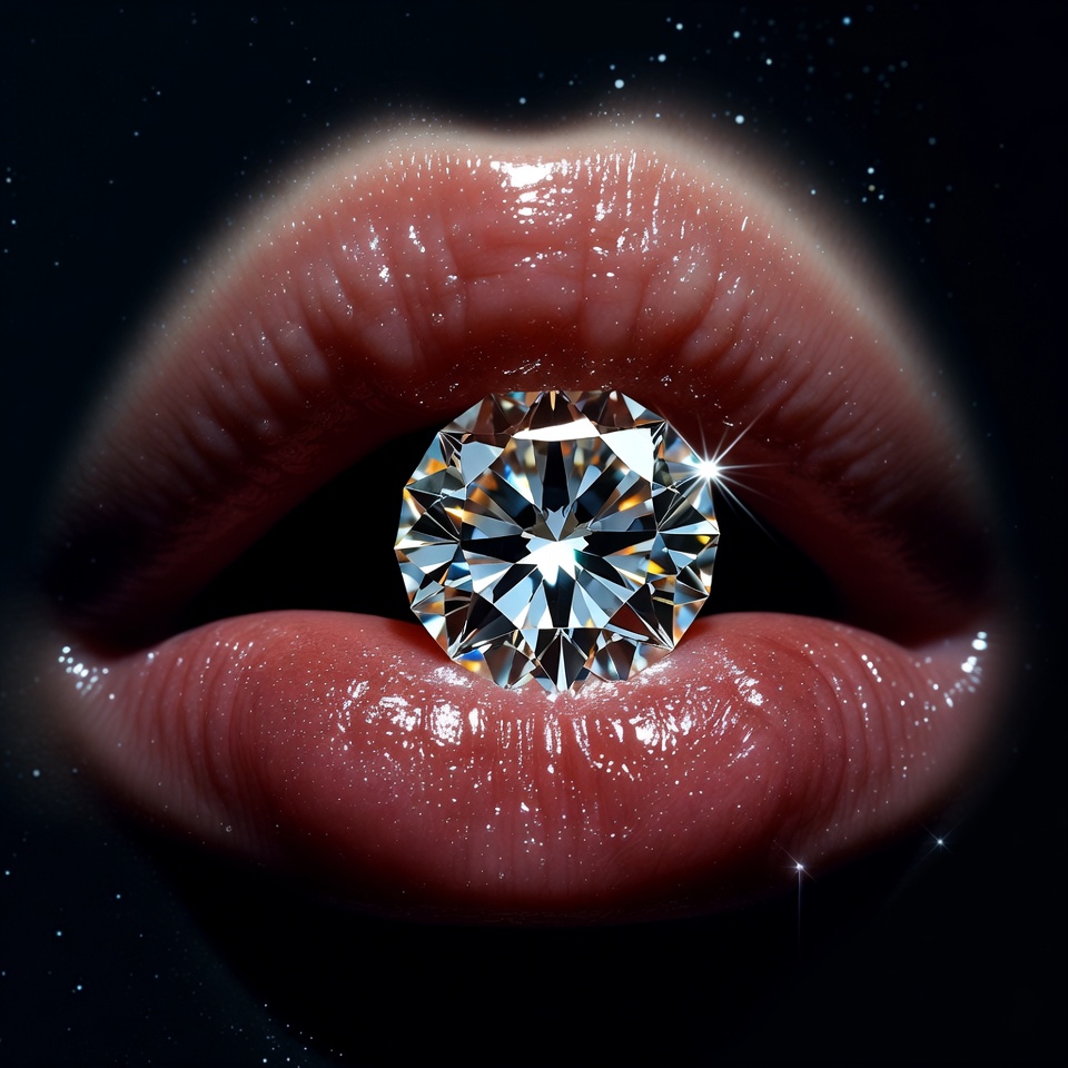 A person holds a large diamond between their lips, showcasing its shine and clarity. The background is dark, highlighting the diamond.