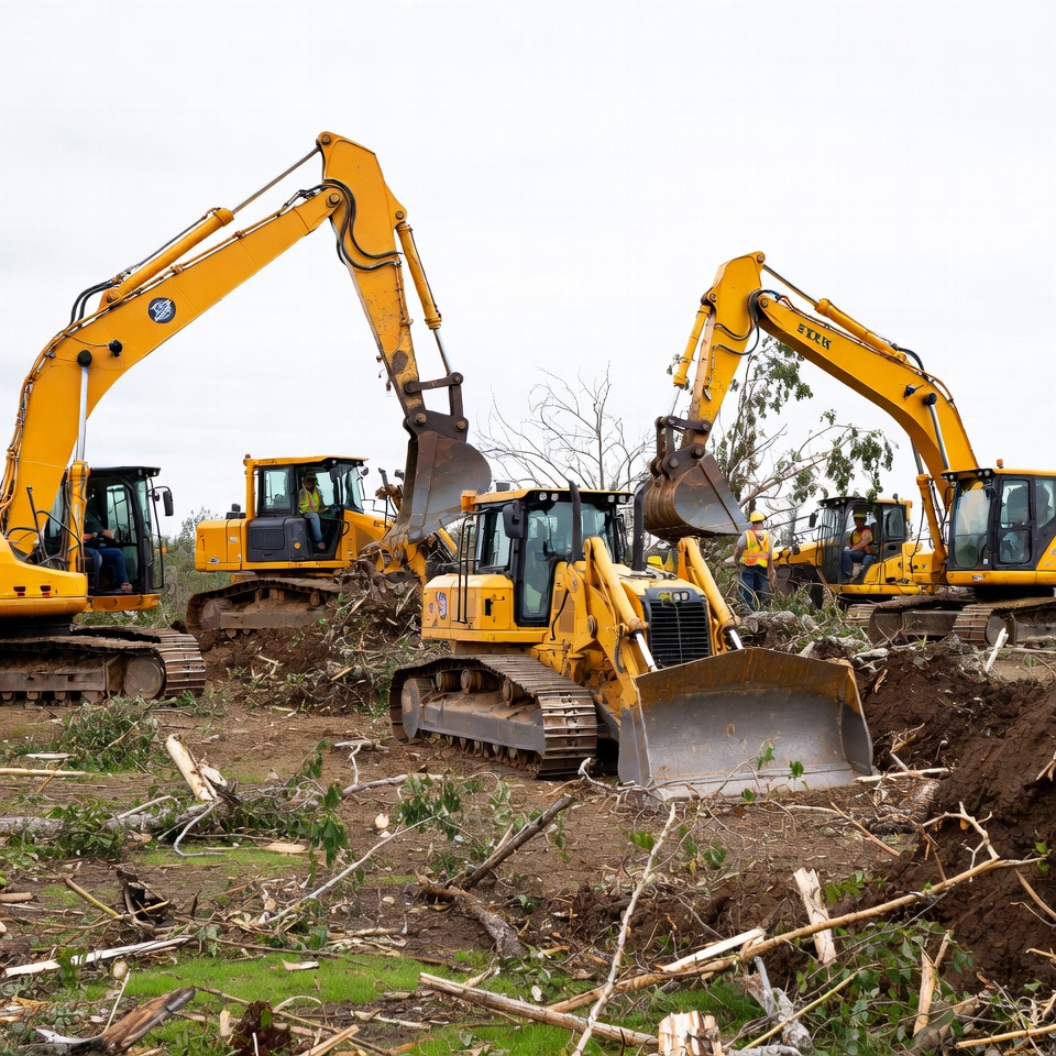 Heavy machinery is clearing land with bulldozers and excavators, preparing the site for new construction. Workers are managing the equipment.