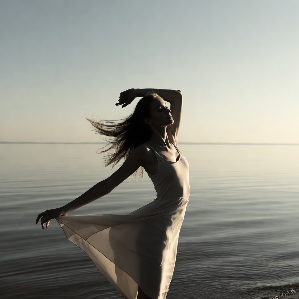 beauty, calm, dance, dress, evening, freedom, hair, happiness, joy, lake, movement, nature, reflection, shore, silhouette, sunset, twirl, water, wind, woman