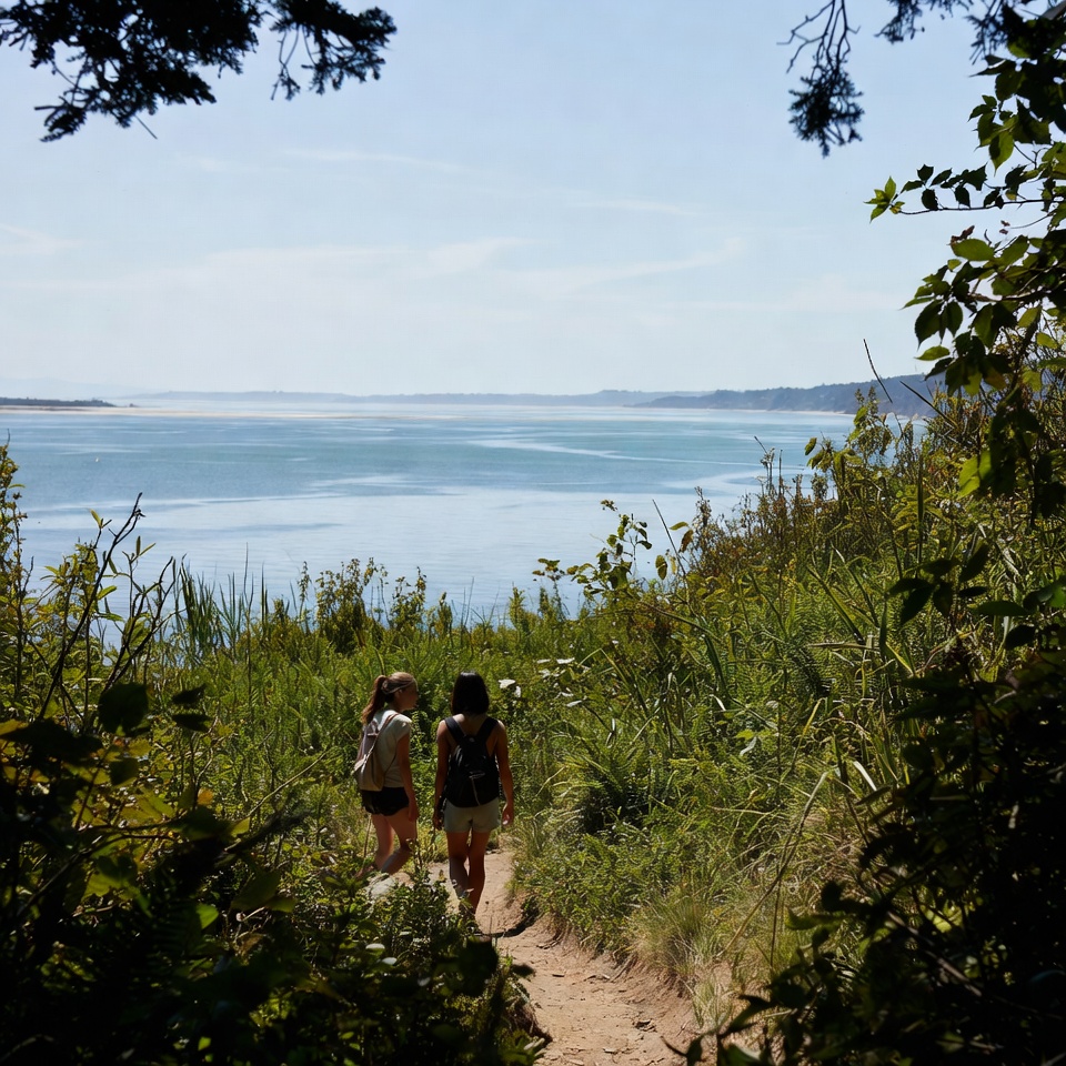 activity, adventure, coast, exploration, friends, greenery, hiking, landscape, nature, outdoor, path, people, summer, sunlight, trail, travel, trees, view, walking, water