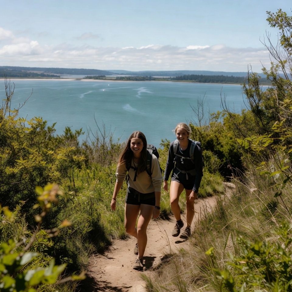 Two women hike up a trail overlooking the water on a sunny day. They carry backpacks and enjoy the fresh air.