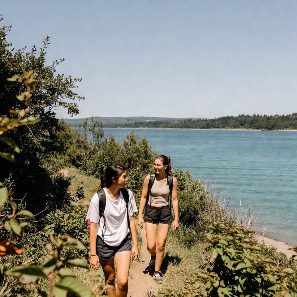 Two friends walk along a path by the river. They carry backpacks and enjoy a sunny day outdoors. The water flows beside them.