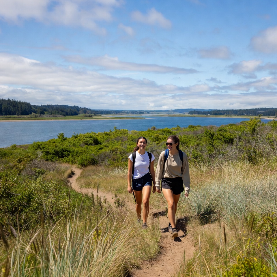 Two friends walk on a dirt trail by the water in a green, natural area. They appear happy and enjoy their outdoor activity together.