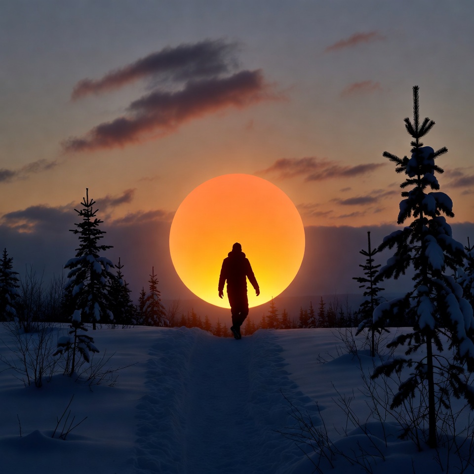 A person walks along a snowy path with tall trees. The sun sets behind them, creating a large orange glow in the sky.