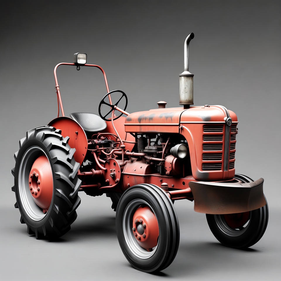 A red tractor sits in a studio setting. It has large wheels and visible engine parts. The tractor appears well-maintained and shiny.