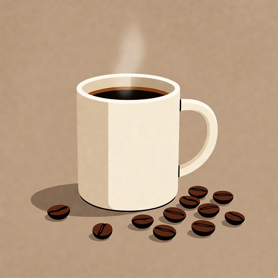 A white cup filled with steaming coffee sits beside scattered coffee beans on a brown surface. The scene is simple and inviting.
