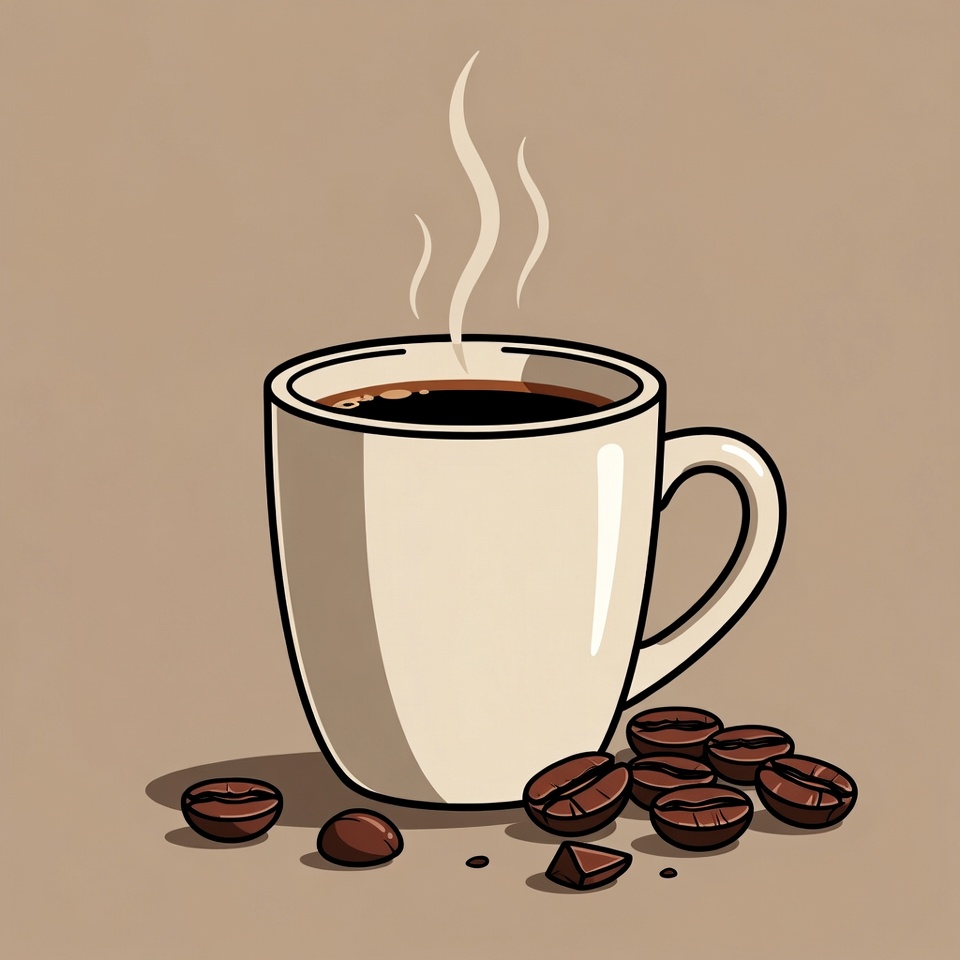 A white cup filled with hot coffee sits on a simple surface. Coffee beans are scattered nearby.