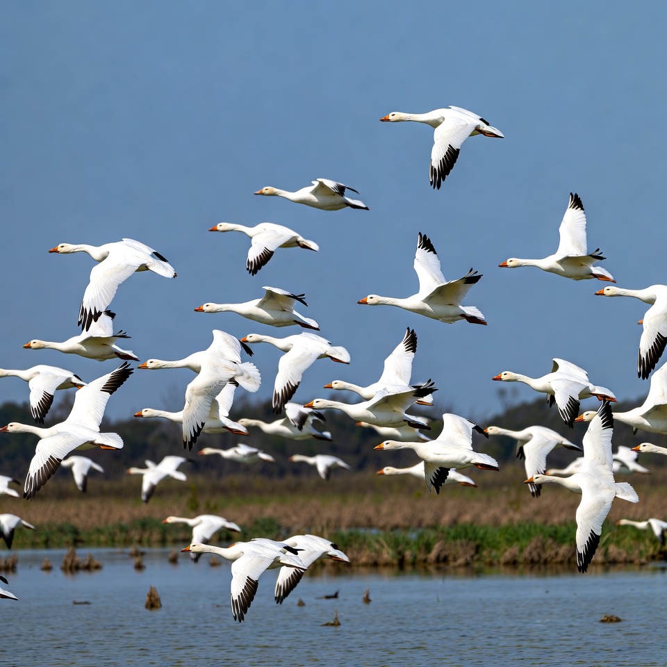 Snow geese flying over wetland area