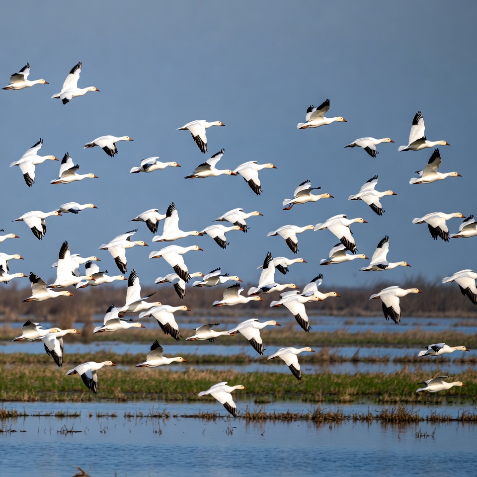 Snow geese flying over wetlands