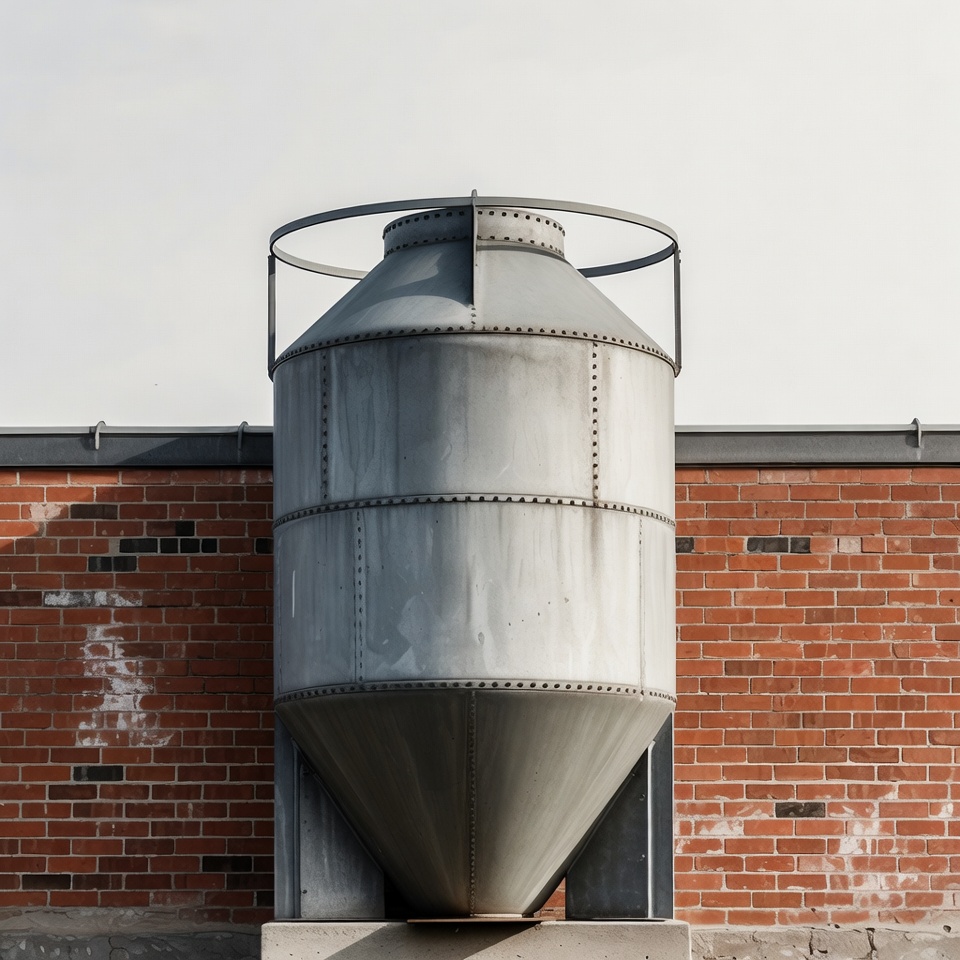 A gray metal storage tank sits on a concrete base against a brick wall. The tank appears tall and cylindrical with a dome top.
