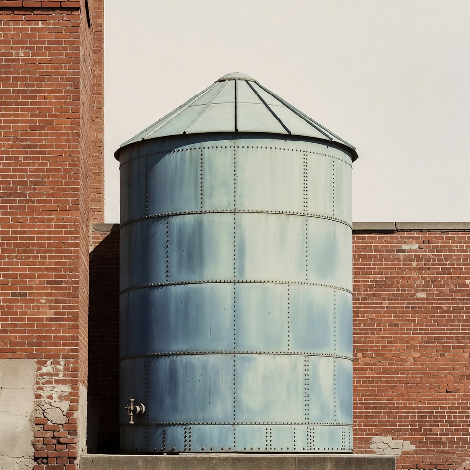 A blue water tank stands next to a red brick wall. The tank has a pointed roof and metal rivets. Sunlight highlights its round shape.