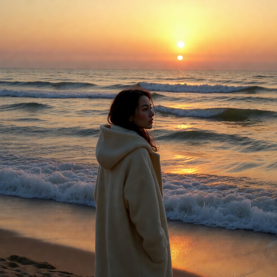 A woman stands on the beach watching the sun set over the ocean waves. The warm tones fill the sky during the evening.