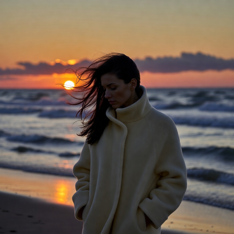 beach, coat, colors, evening, horizon, nature, ocean, reflection, scene, shore, silhouette, sky, solitude, standing, sunlight, sunset, warm, waves, wind, woman