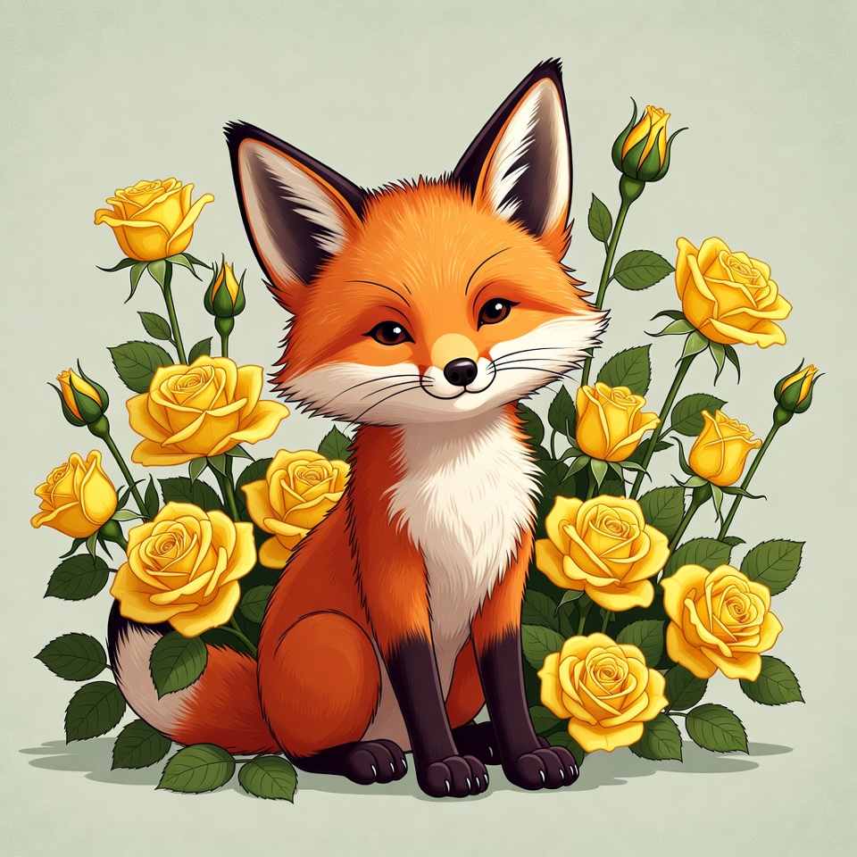 A fox is sitting in front of yellow roses in a garden setting. The fox has bright orange fur and a friendly expression.