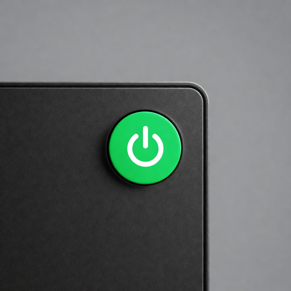 A green power button is seen on the surface of a black device against a plain gray background. The button indicates power on or off.