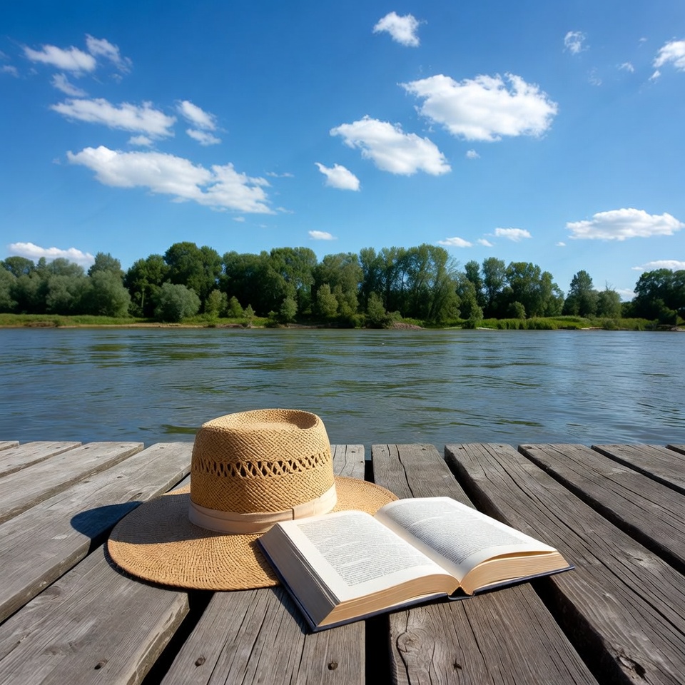 A sun hat lies next to an open book on a wooden dock by a river under a blue sky with clouds. Trees are visible in the background.