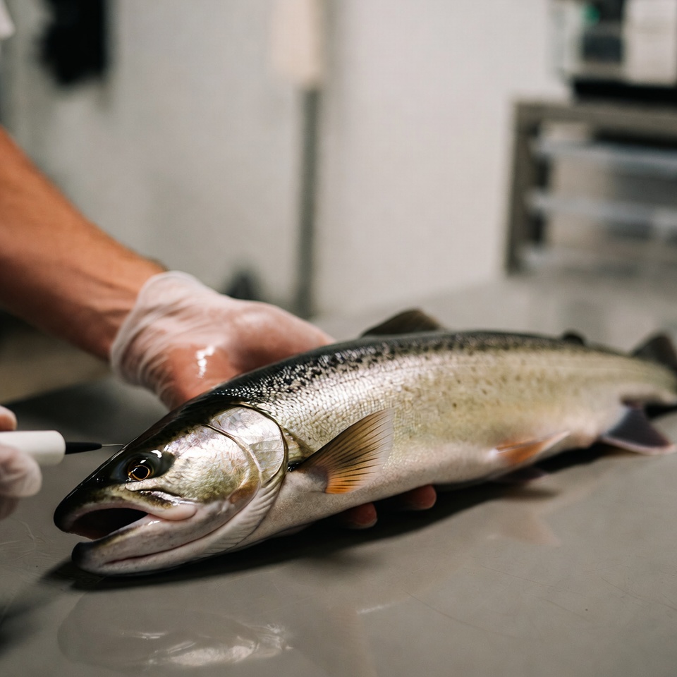 A person in gloves holds a trout on a clean surface in a kitchen. The fish is being prepared for cooking at a restaurant.