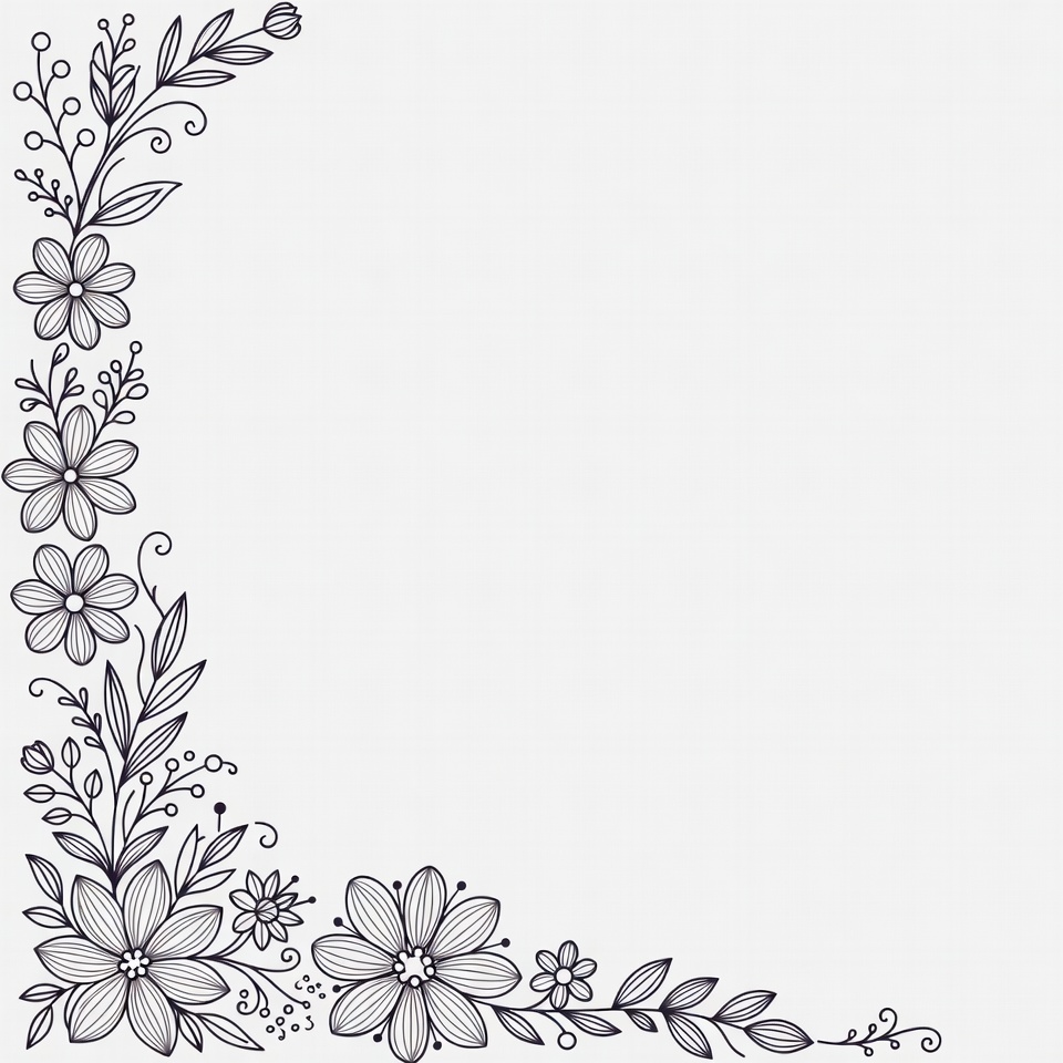 A corner design features various flower shapes and plants drawn in black outline. Suitable for crafting or decorating purposes.