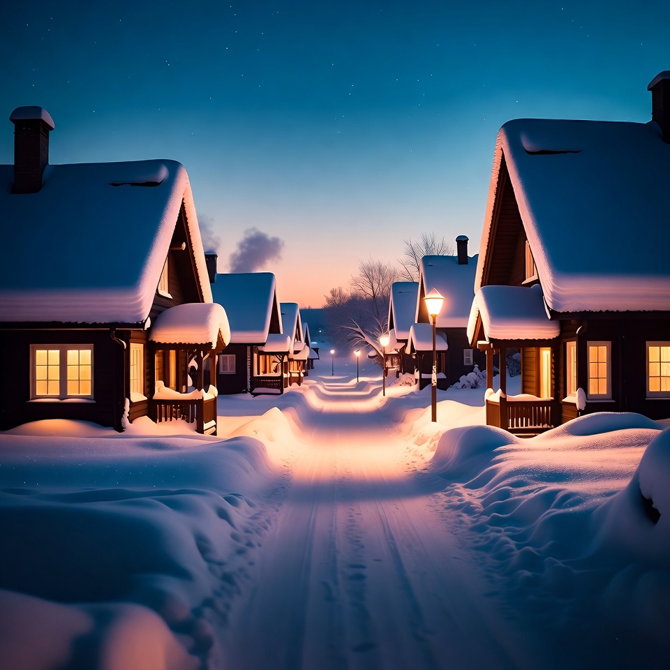 Snow covers a quiet street with houses. Warm light shines from windows. Street lamps light the path as dusk falls.