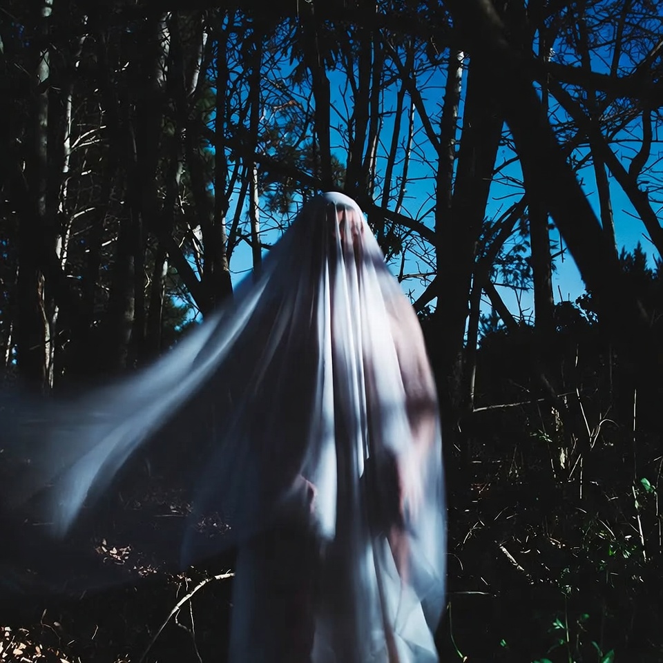 dark, eerie, fabric, figure, forest, isolation, landscape, light, movement, mysterious, nature, night, outdoors, scene, shadows, silhouette, standing, trees, twilight, white