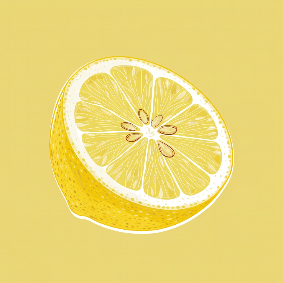 A halved lemon is placed on a bright yellow background. The lemon shows its juicy interior and seeds, highlighting its freshness.