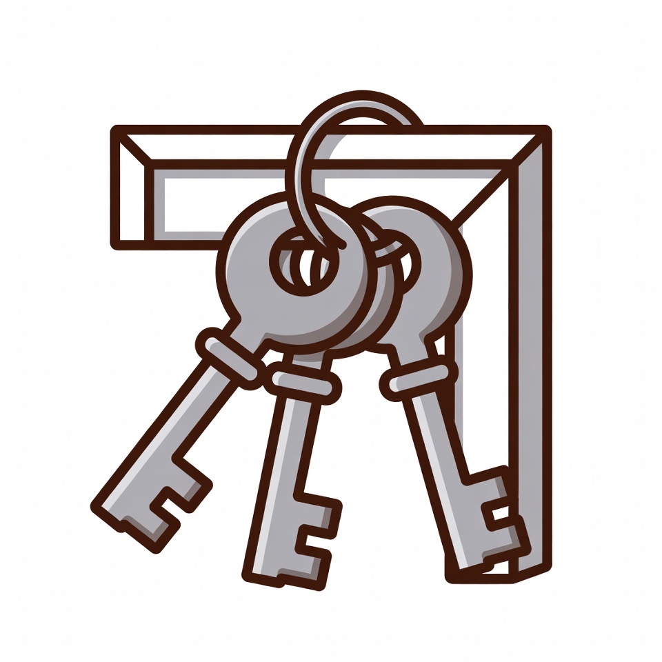 Three keys are hanging on a hook near a wall. The area looks organized and well-kept. The setup is simple and functional.