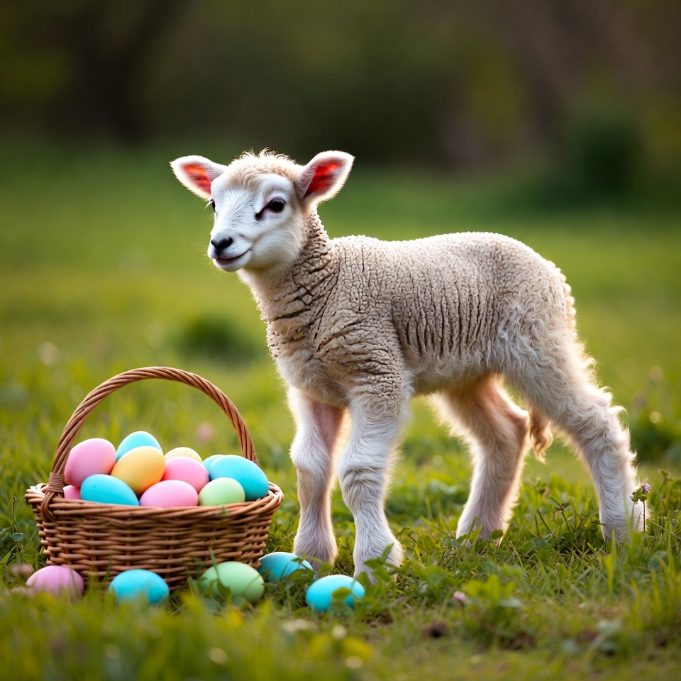 A young lamb stands near a basket filled with bright eggs on grassy ground in a sunny outdoor setting.