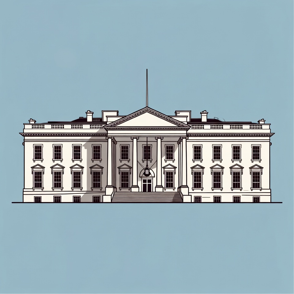 A drawing of the White House shows its distinct architecture and features. The image highlights the building's front view, focusing on its steps.