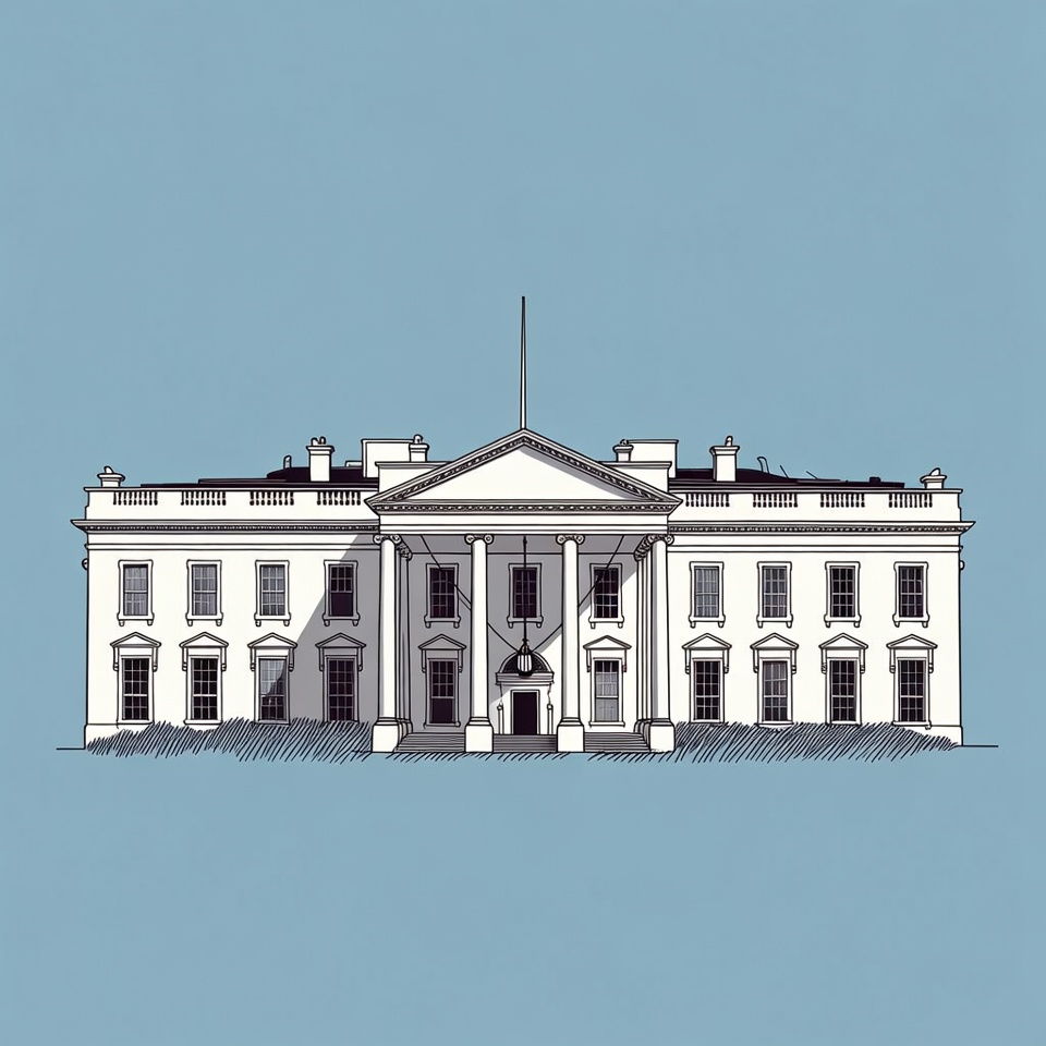A sketch of the White House shows its iconic structure. The drawing highlights the columns and roof design on a solid blue background.