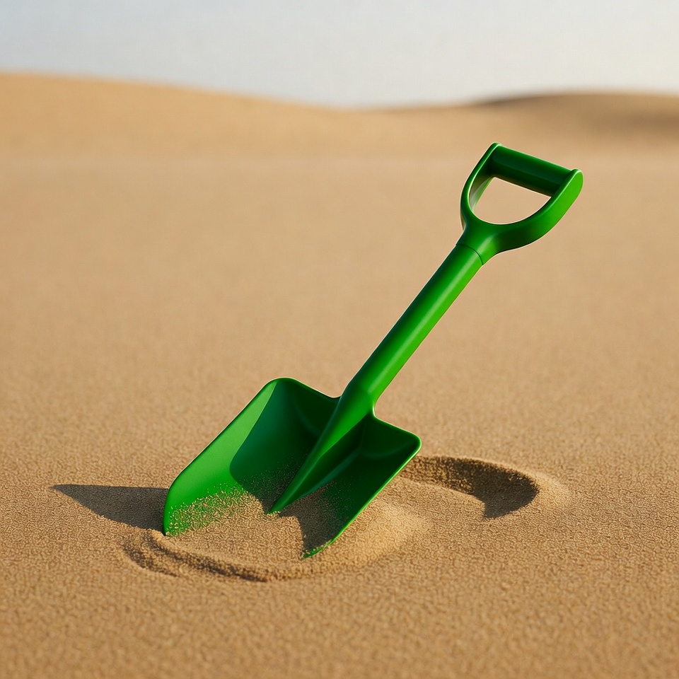 A green shovel stands upright in a sandy area, showing its handle above the fine grains. The setting is bright and dry, with clear sky.