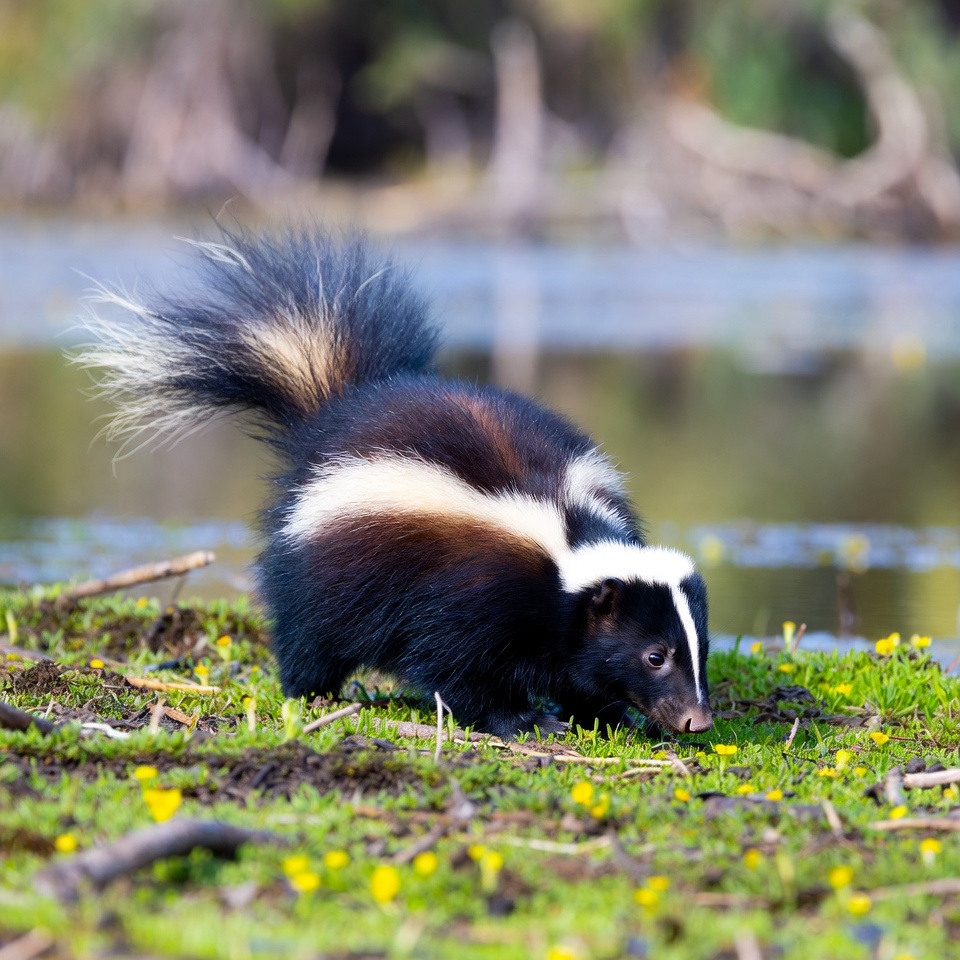 animal, black, creek, ecosystem, flowers, food, foraging, furry, grass, habitat, mammals, nature, outdoor, scent, skunk, tail, water, wetlands, white, wildlife