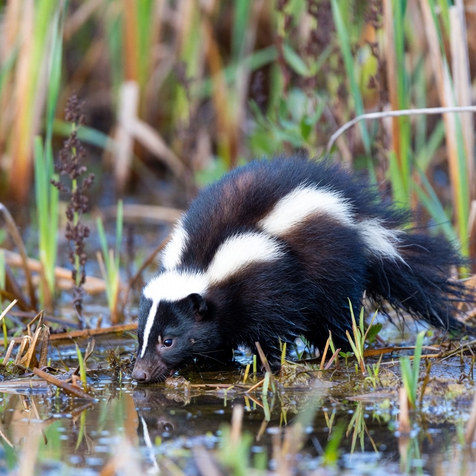 North America, animal, environment, food, foraging, grass, habitat, mammal, marsh, nature, plants, playful, predator, searching, skunk, small, striped, water, wetlands, wildlife