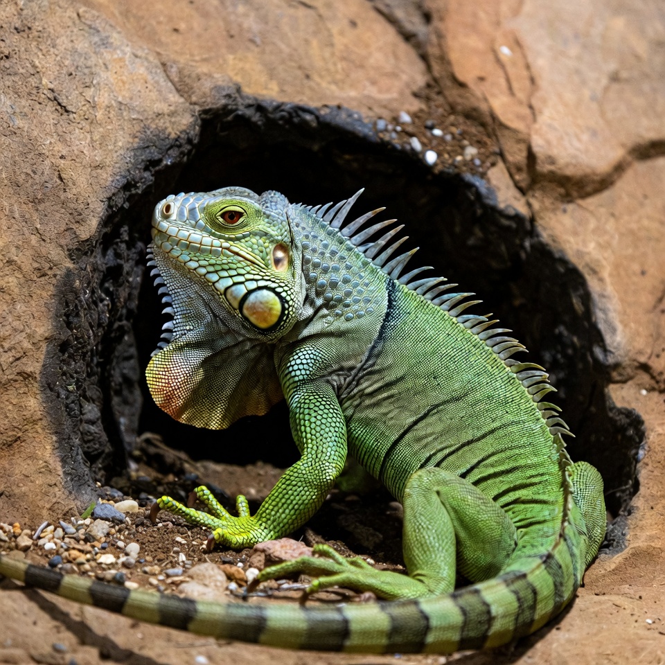 A large green iguana sits beside a cave in a rocky area. It displays its scales and features in a natural habitat during daylight.