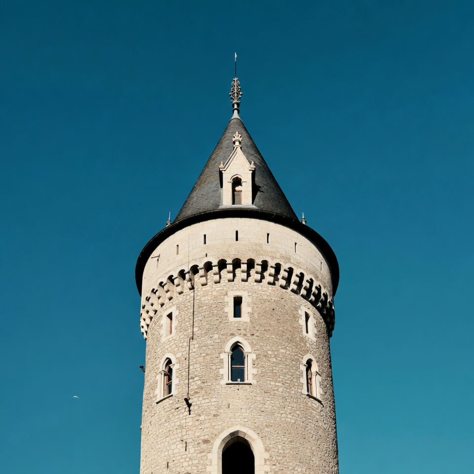 A stone tower stands tall against a clear blue sky. The structure features a pointed roof and an ornate design.