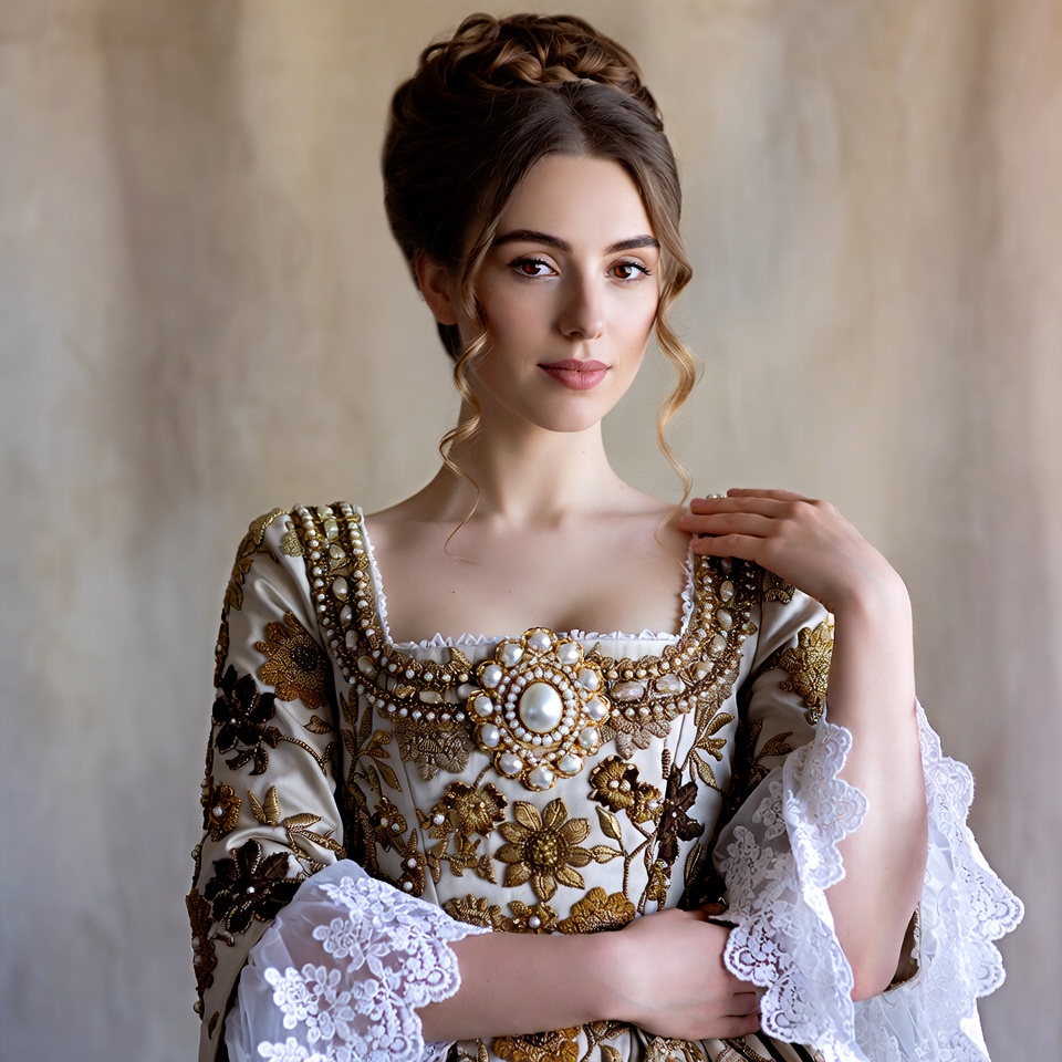 art, beauty, casual, cultural, decorated, elegant, expression, fabric, fashion, indoor, intricate designs, jewelry, lace, pattern, portrait, posing, room, styled hair, traditional dress, woman