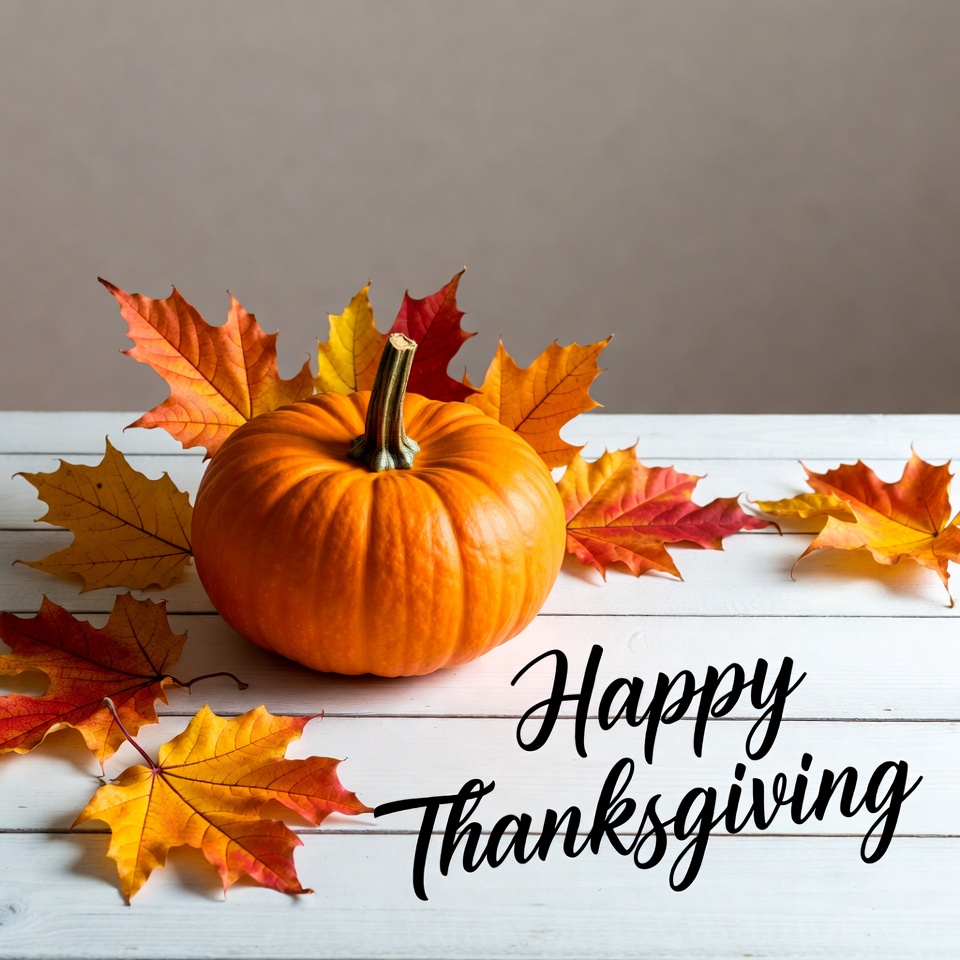 A pumpkin sits on a wooden table surrounded by colorful autumn leaves during the Thanksgiving season.