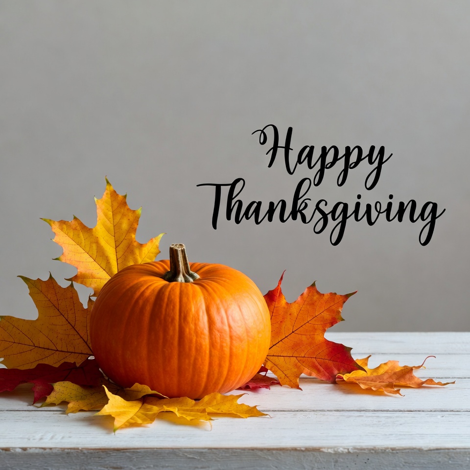 A pumpkin sits on a wooden surface surrounded by colorful autumn leaves. Celebratory text marks the Thanksgiving season.