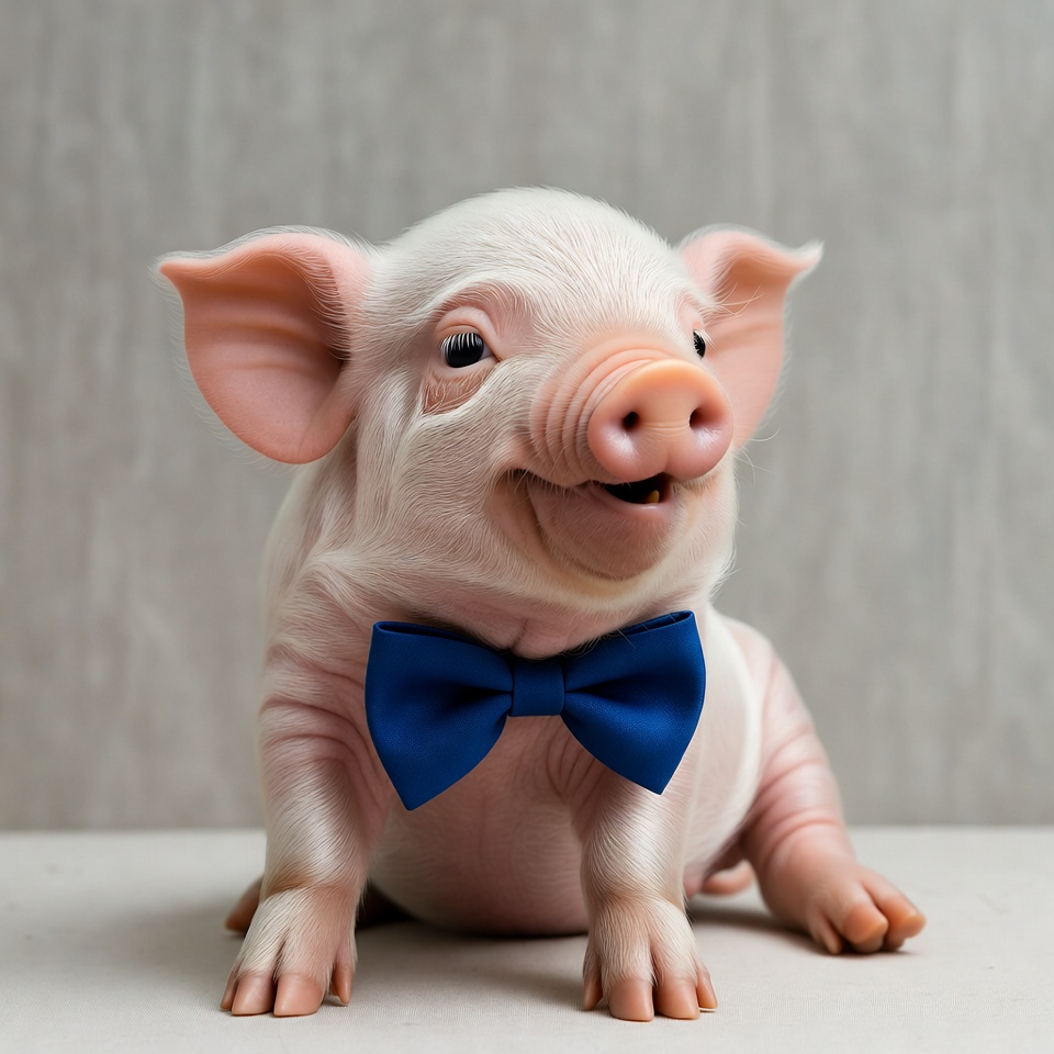 A small piglet sits on a surface, wearing a blue bow tie. It has a playful expression and appears to be comfortable.