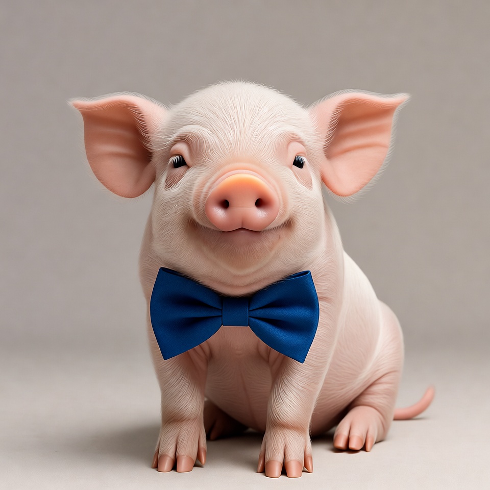 Pig with blue bow tie poses happily