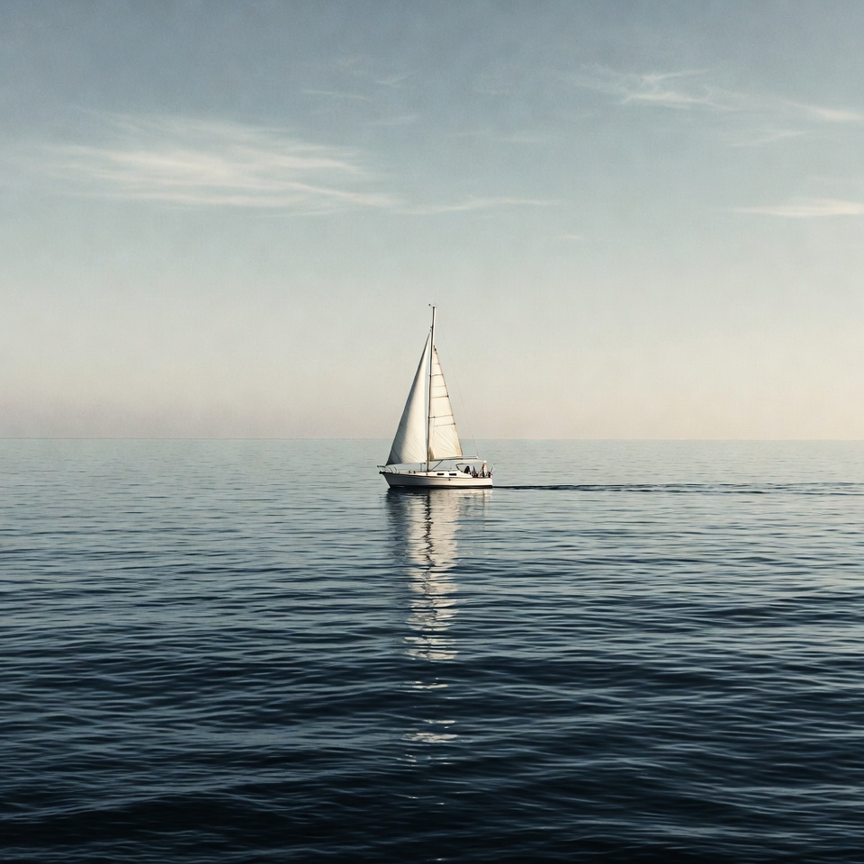 A sailboat moves smoothly across still water under a clear sky. The sun casts a soft light, reflecting on the surface.